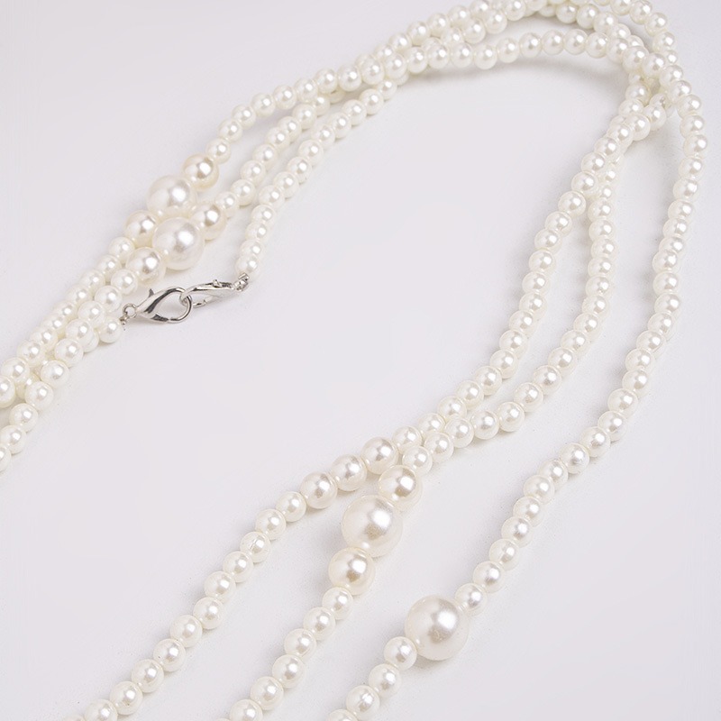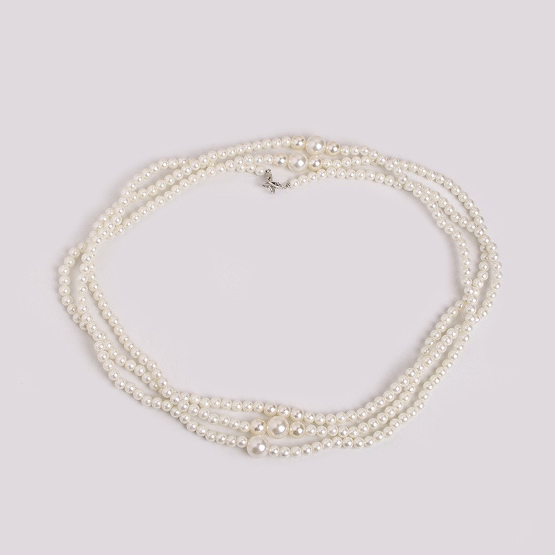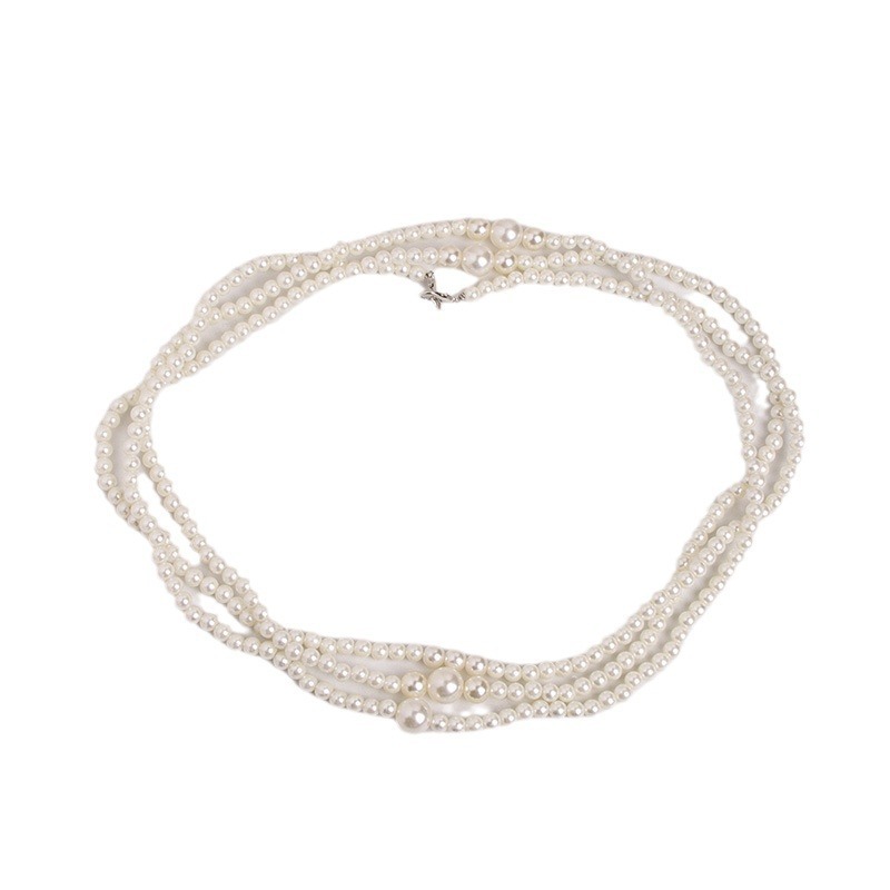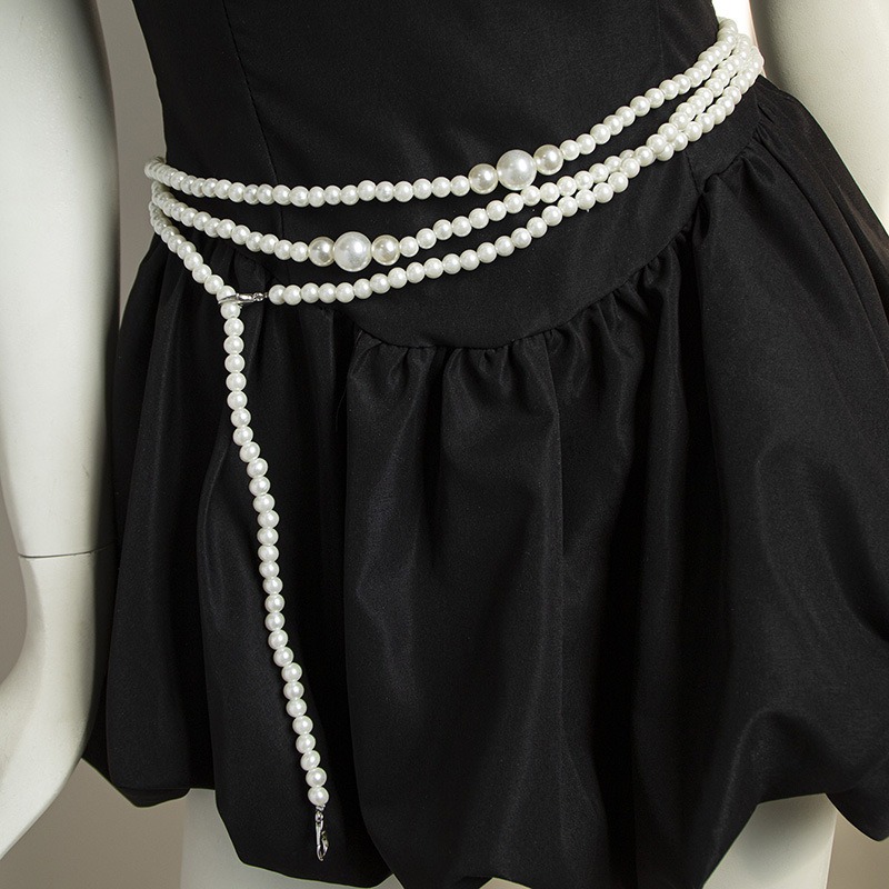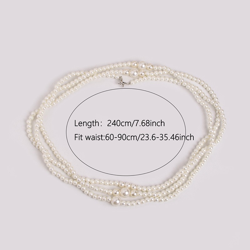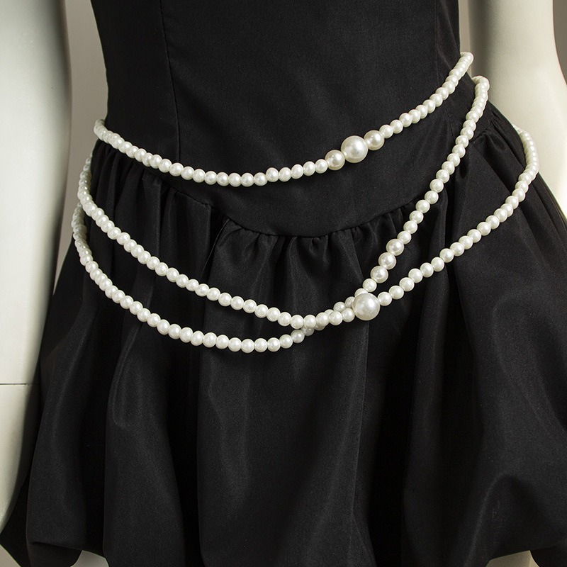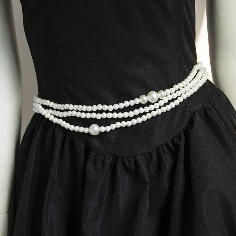 複数連のパールがウエストラインを美しく演出し、どんなコーディネートにも上品さをプラスします。