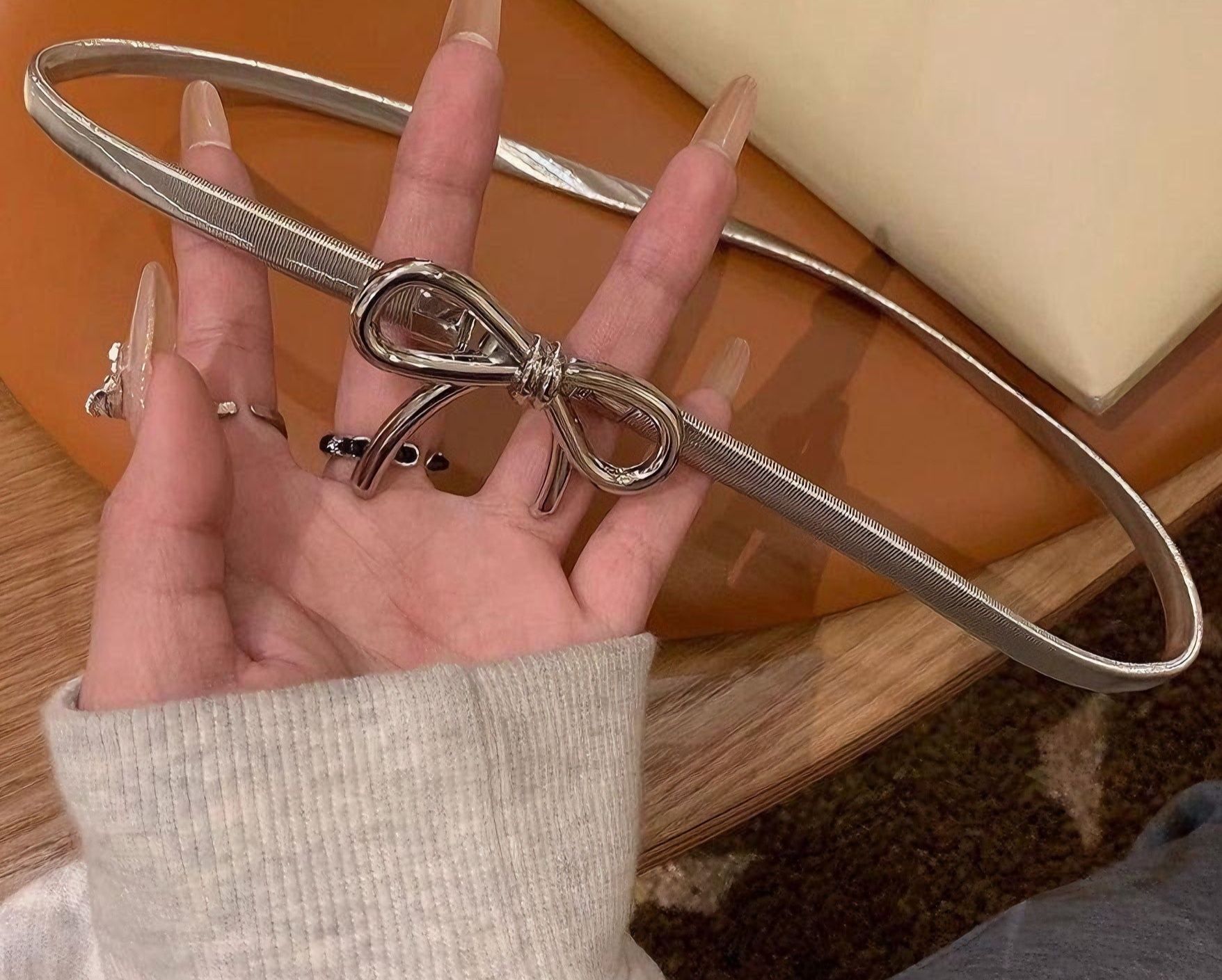 繊細なメタルのリボンバックルが女性らしさを引き立て、シンプルながら存在感のあるアクセントになります。