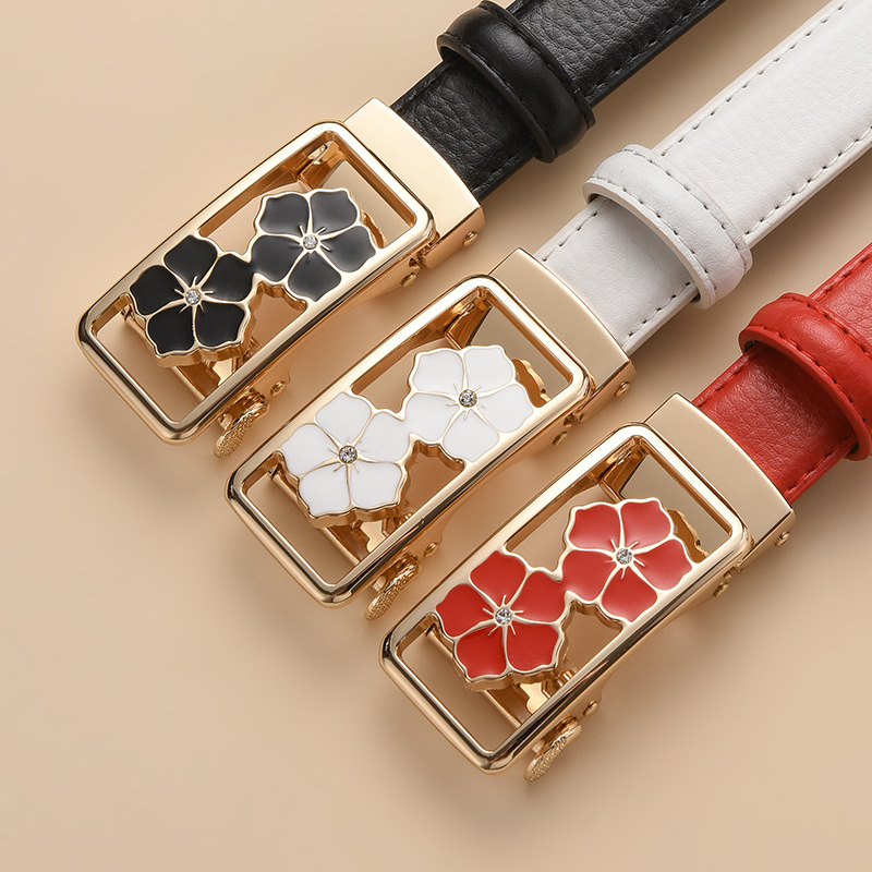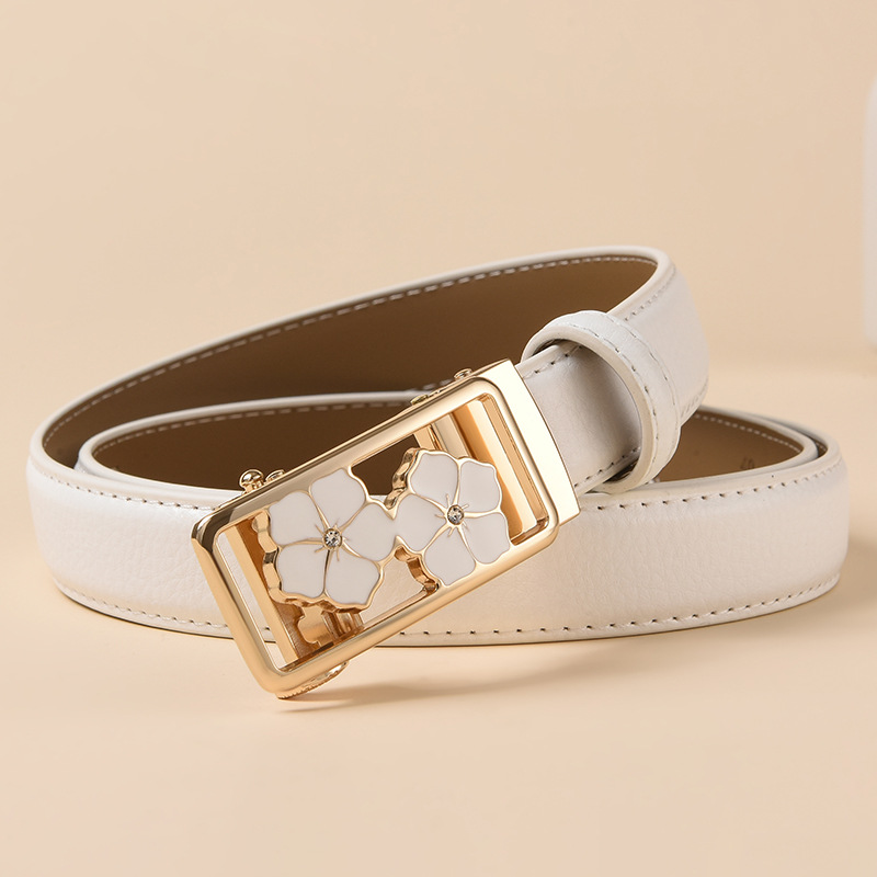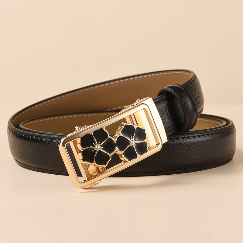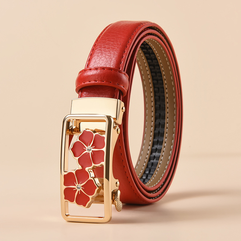 上品な花モチーフをあしらった装飾バックルが魅力的なレディース ベルトです。