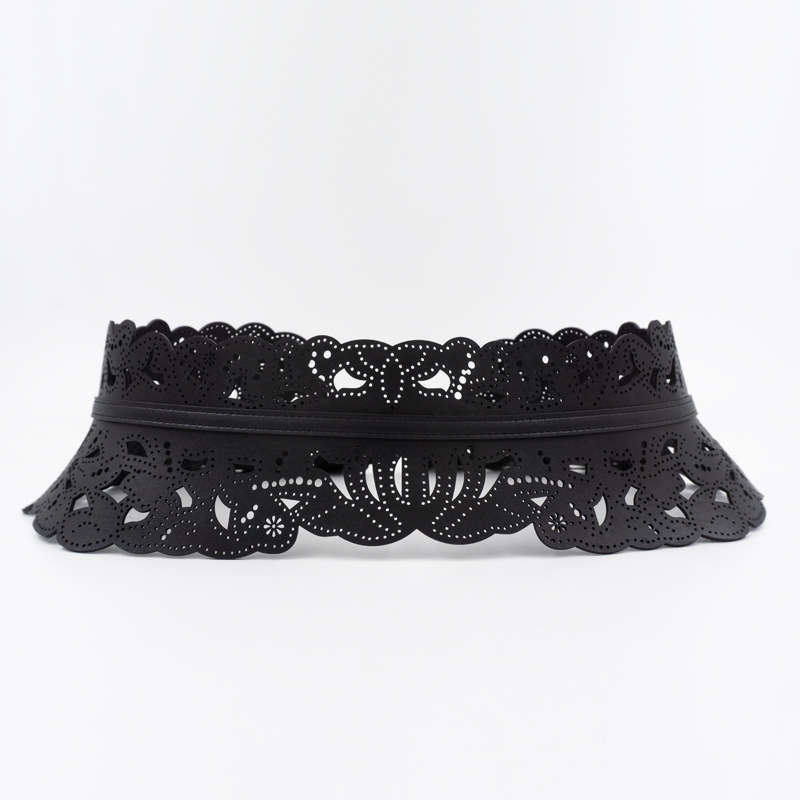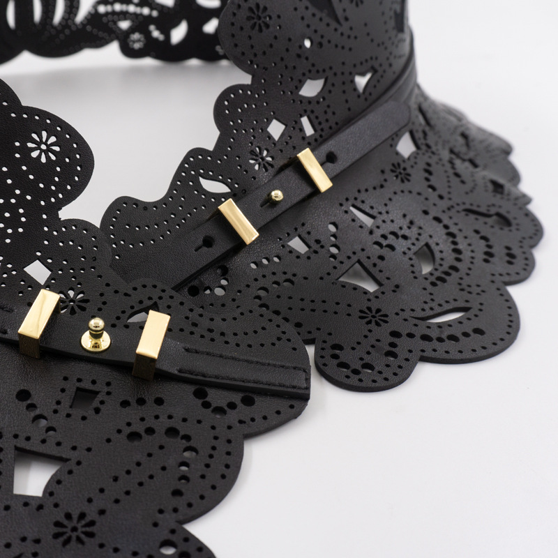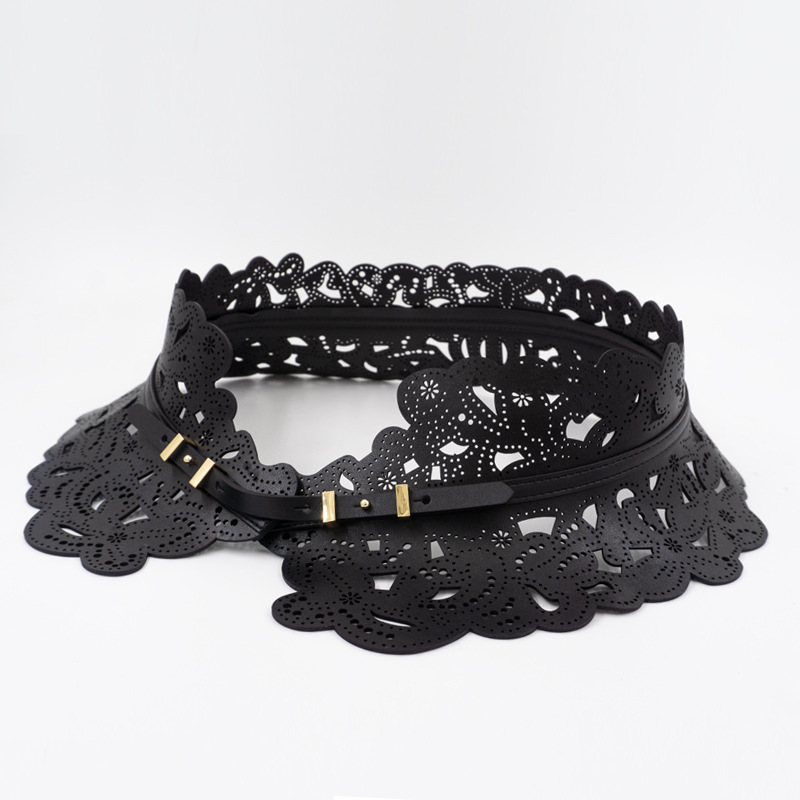 花柄のレース模様が優雅な印象を与えるレザーベルトで、ウエストマークに最適な幅広デザインが特徴です。